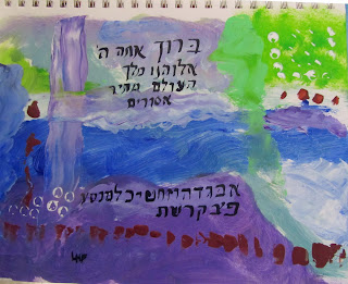 I have been playing with acrylic paint in my mixed media notebook. Once the paper dried I also decided to try my calligraphy pen and ink. Unfortunately my hands are too shaky (Parkinsons) to do the Hebrew lettering well any more. That is sad, but I can still play with the ink. I was just experimenting with colors and mark making. I used a palette knife, plastic type spatula brush, bottle top and brushes. Fun to paint while listening to "Joe Cool's Blues" with Wynton and Ellis Marsalis on an old CD.
